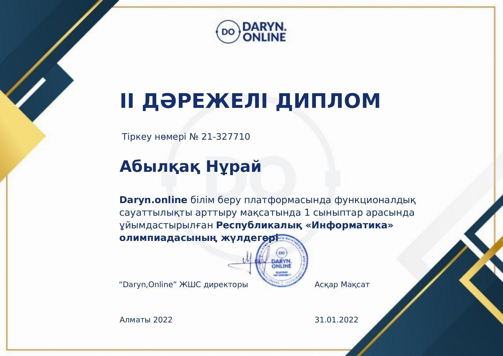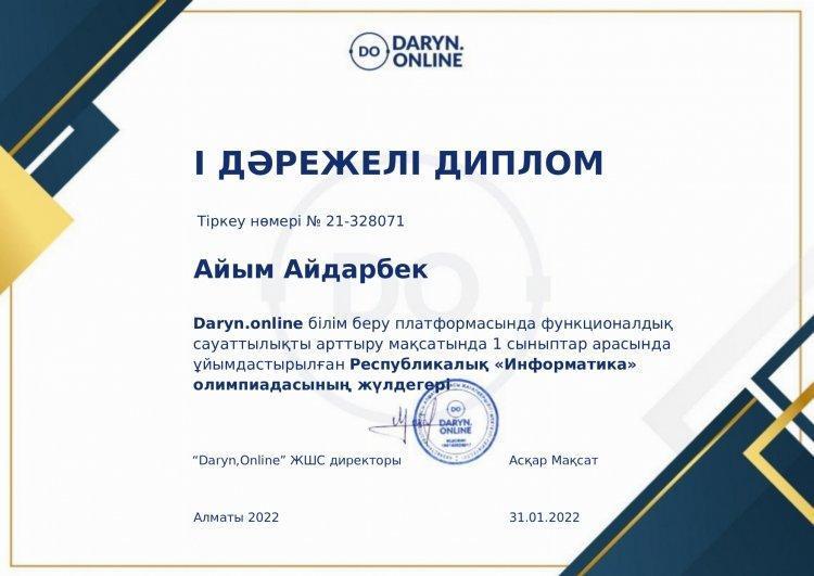 Daryn.online білім беру платформасында функционалдық сауаттылықты арттыру мақсатында 1 сыныптар арасында ұйымдастырылған Республикалық «Информатика» олимпиадасының жүлдегері