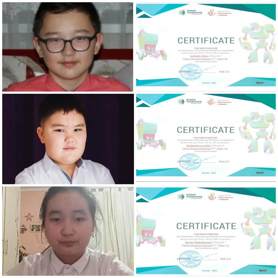 Бұл Халықаралық робототехника байқауына ШҚО Семей қаласы "Ыбырай Алтынсарин атындағы №37 гимназияның" 7-сынып оқушылары Олжас Серікқалиев, Дінмұхаммет Маратов, 6-сынып оқушысы Аяулым Нұрхамитова дайындаған робототехника программалары үшін сертификат беріледі. Жетекшісі: Алмат Хамитов.