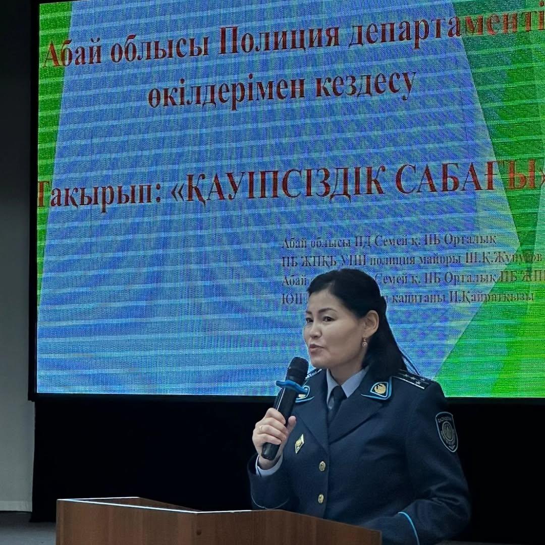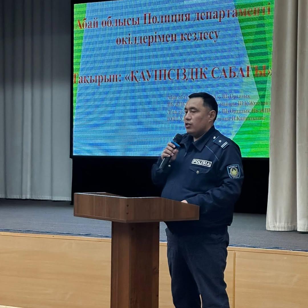 07.10.2025 жылы 8 «А», «Б», 9 «А», 10 «А», 11 «А» сынып оқушыларына «Таза Қазақстан», республикалық жедел –профилактикалық алдын алу мәселесі бойынша директордың тәрбие жұмысы жөніндегі орынбасары Ш.А.Турсумбаева , әлеуметтік педагог М.Ж.Сайлауғазина және Орталық полиция бөлімінің жергілікті полиция бөлімшесінің ювеналдық полиция тобының учаскелік полиция капитаны И.Кайраткызы, Абай облысы ПД Семей қ ПБ Орталық ПБ КПБ аға жедел уәкілі полиция майоры Көбеген Думан Көбегенұлы, Абай облысы ПД Семей қ. ПБ Отарлық ПБ ЖПҚБ УПИ полиция майоры Ш.Қ.Жунусовпен бірлесіп «Буллинг», «Қауіпсіздің сабағы» тақырыбы бойынша профилактикалық дәрістер жүргізілді. ҚРҚК-нің 188,190,191 баптарымен таныстырылды. Оқушылар ақпарат алып, сұрақтар қойып, кері байланысқа шықты. Достық қарым-қатынасты нығайтатындарын жеткізді.
