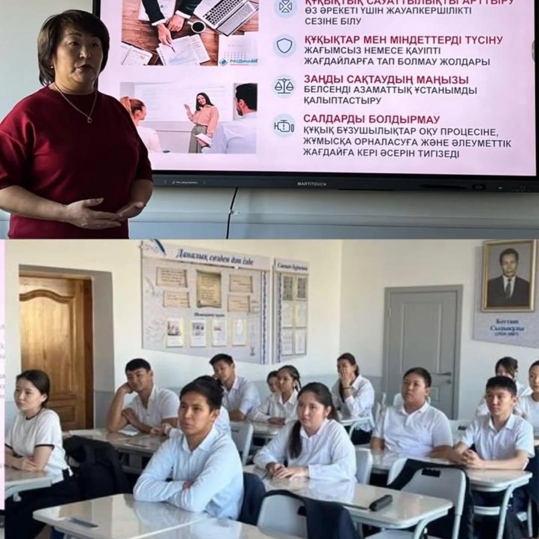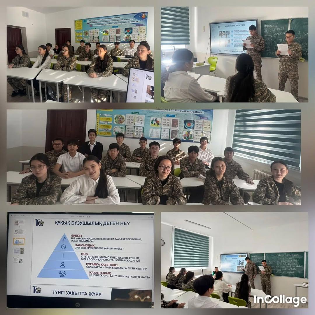 24.10.2025 жылы “ЗАҢ ЖӘНЕ ТӘРТІП: КӘМЕЛЕТКЕ ТОЛМАҒАНДАР АРАСЫНДАҒЫ ҚҰҚЫҚ БҰЗУШЫЛЫҚТАРДЫҢ АЛДЫН АЛУ” тақырыбында құқықтық сауаттылықты арттыру мақсатында 11-сыныптар арасында тәрбие сағаты өткізілді.