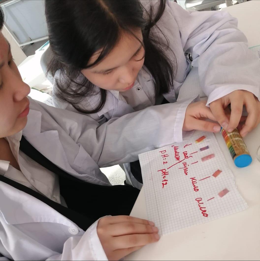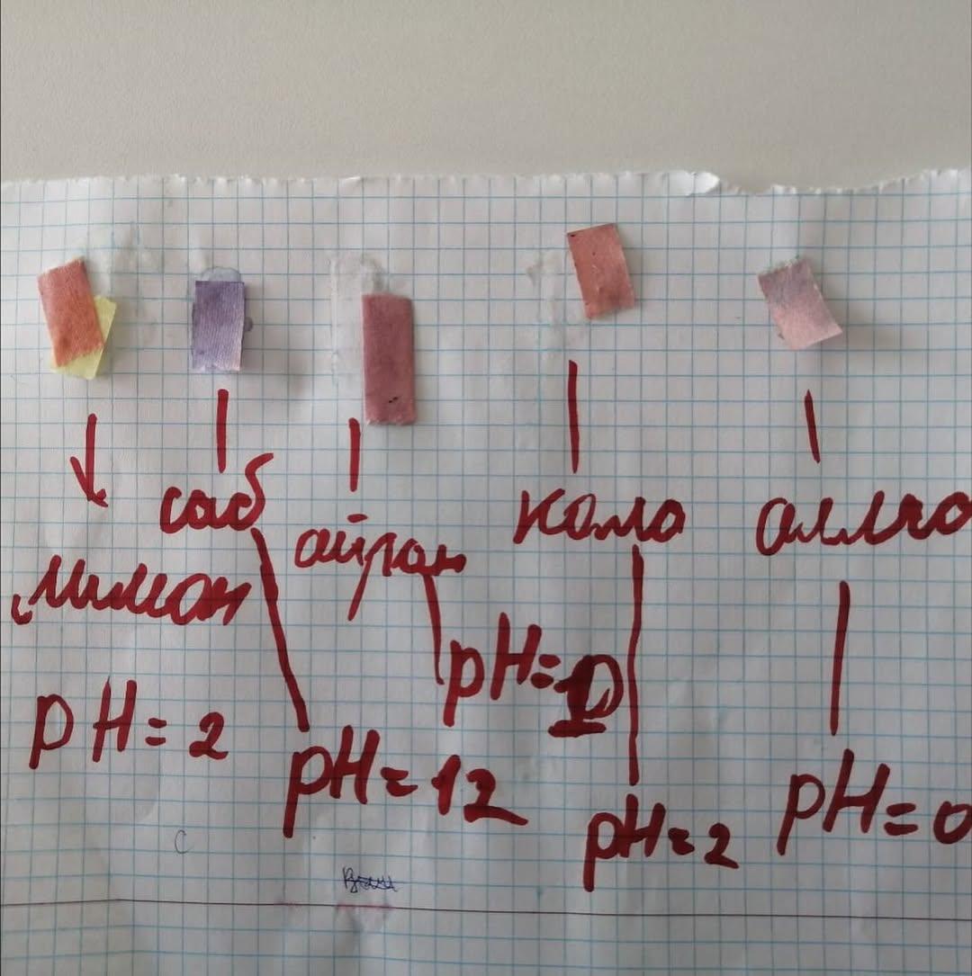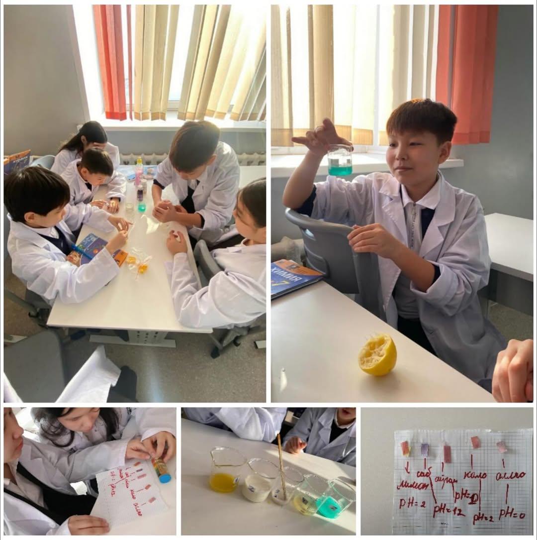 Оқыту мақсаты: Қышқылдар мен негіздердің қасиеттерін сипаттау; Индикаторлардың түсінің өзгерісін тәжірибеде анықтау. Оқушылар күнделікті тұрмыста қолданылатын заттардың қышқылдық, негіздік ортасын анықтап тәжірибелер жасады.