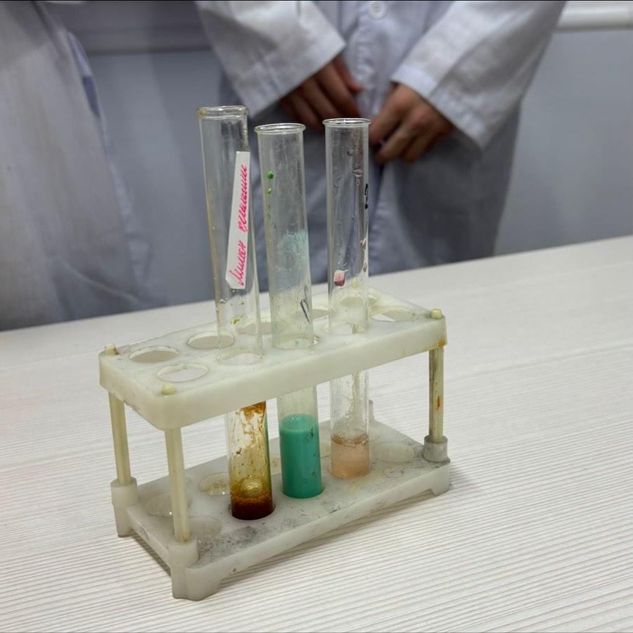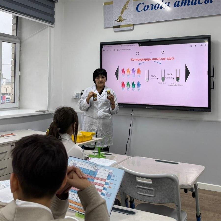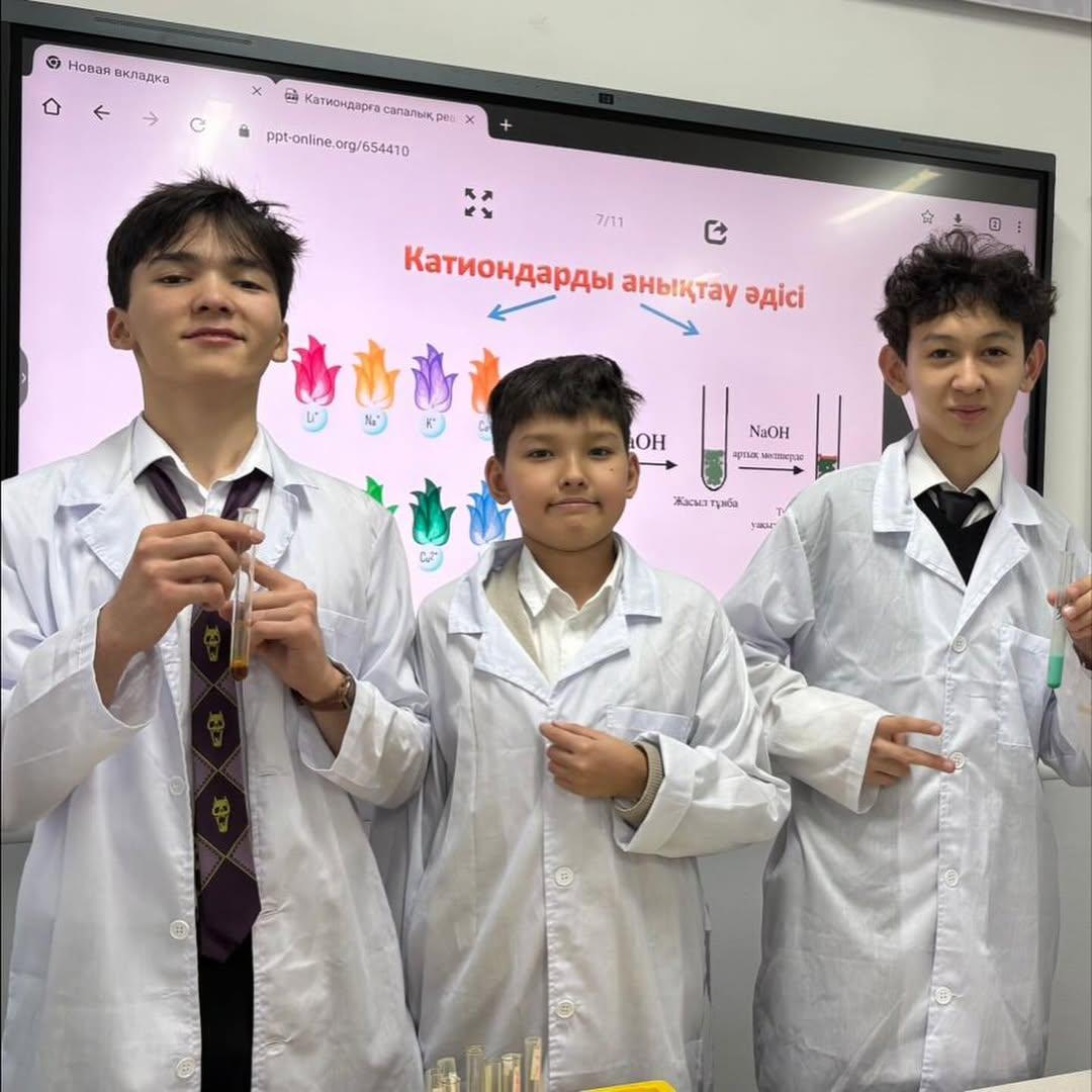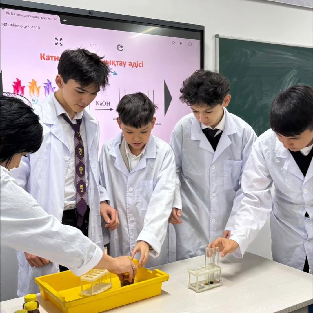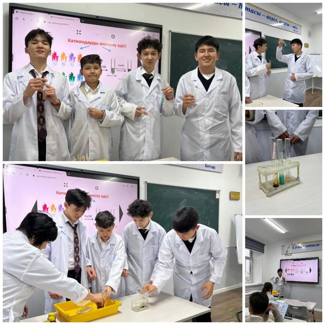 Катиондарға сапалық реакциялар тақырыбында «Li+, Na+, K+, Ca2+, Sr2+, Ba2+, Cu2+ катиондарын жалын түсінің боялуы», «Al3+, Fe3,, Cu2+ катиондарына сапалық реакциялар бойынша анықтау» зертханалық тәжірибелерін жасап, реакция теңдеулерін жазып қорытынды жасады, Сынауықтарда құйылған белгісіз заттарды реакция белгілеріне қарап болжам жасап анықтауда оқушылар өте жақсы қызығушылық танытты.