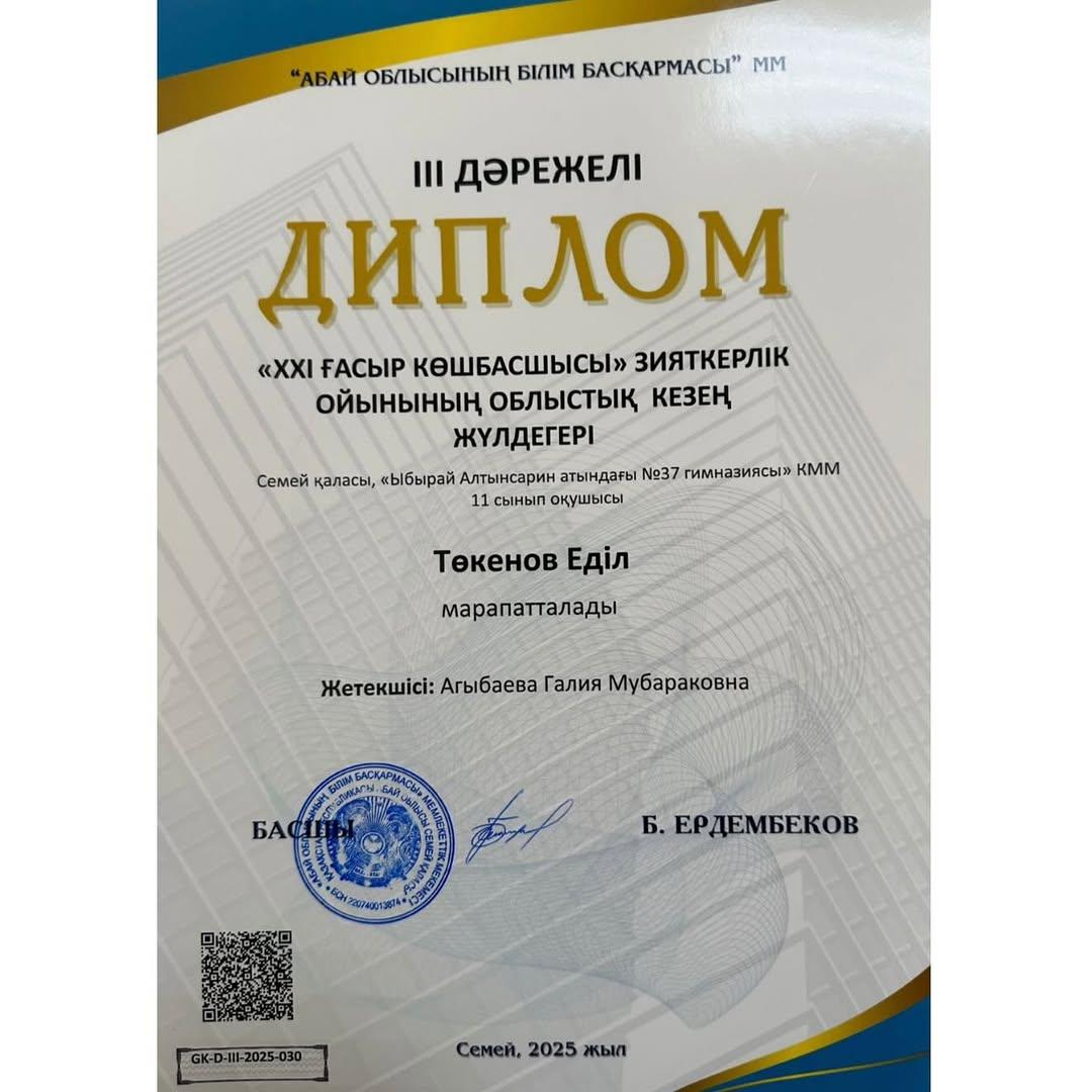 Зияткерлік ойынға 90 білім алушы қатысты. Білім бәйгесінде бағын сынап, жоғары нәтиже көрсетіп, 🥉 дәрежелі дипломмен марапатталған 11 “А” сынып оқушысы Төкенов Еділ мен жетекшісі Агыбаева Галия Мубараковнаны кезекті жеңістерімен ҚҰТТЫҚТАЙМЫЗ!!!