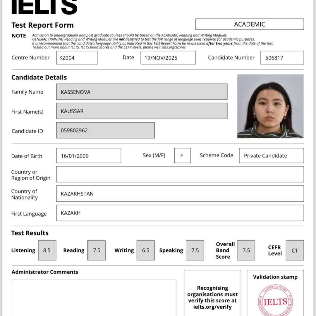 11-сынып оқушысы гимназия мақтанышы Касенова Кәусар IELTS сертификат иегері. Жарайсың Кәусар!