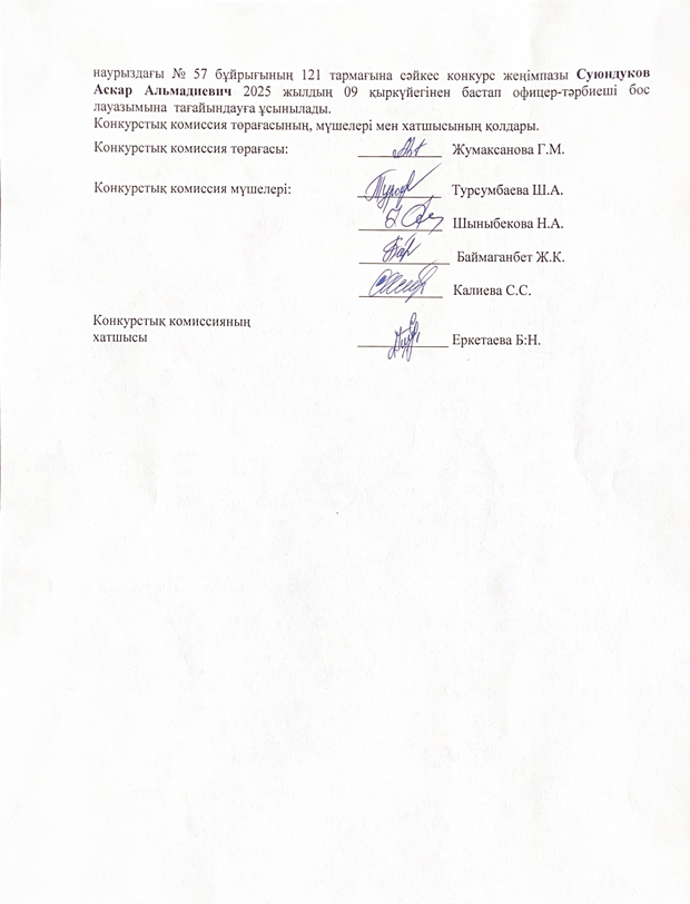 Абай облысы білім беру басқармасының Семей қаласы білім бөлімінің «Ыбырай Алтынсарин атындағы №37 гимназиясы» КММ-де гимназияның офицер-тәрбиеші бос лауазымына жарияланған конкурс хаттамасы.