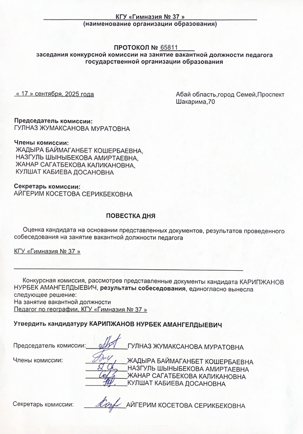 "Ыбырай Алтынсарин атындағы №37 гимназиясы " КММ-і бос орынға вакансия.