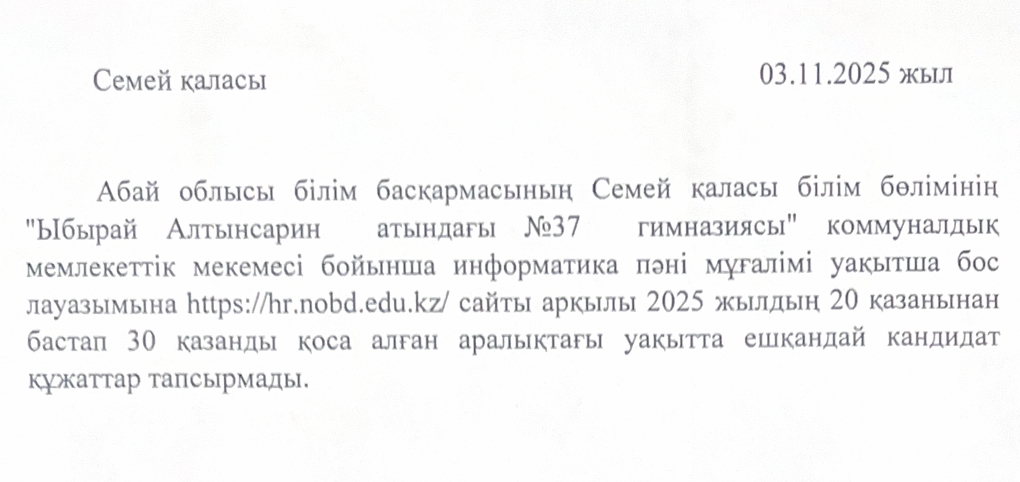 "Ыбырай Алтынсарин атындағы №37 гимназиясы" коммуналдық мемлекеттік мекемесі бойынша бос лауазымдар