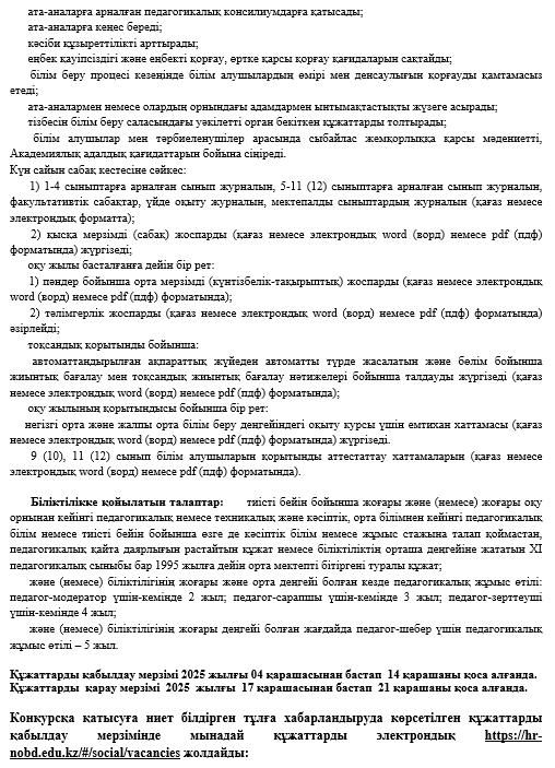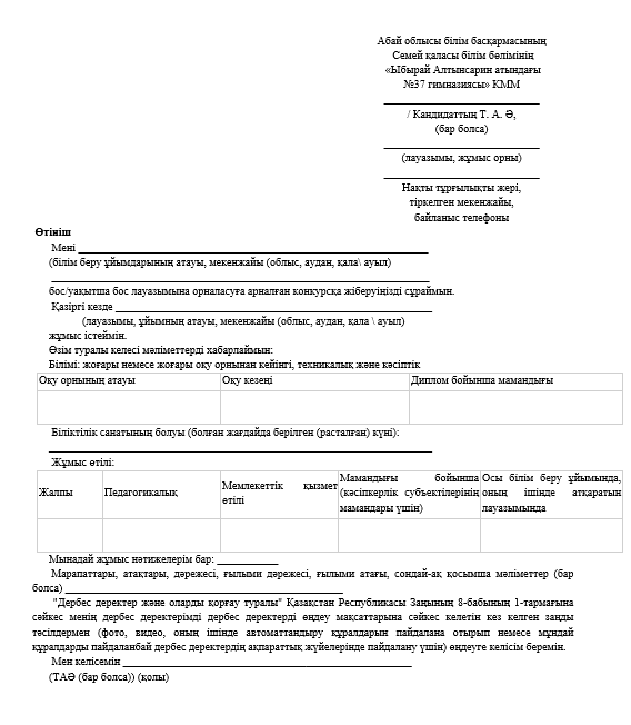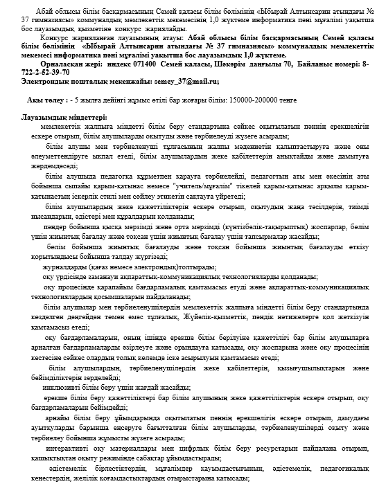 Абай облысы білім басқармасының Семей қаласы білім бөлімінің «Ыбырай Алтынсарин атындағы № 37 гимназиясы» коммуналдық мемлекеттік мекемесінің 1,0 жүктеме информатика пәні мұғалімі уақытша бос лауазымдық қызметіне конкурс жариялайды.