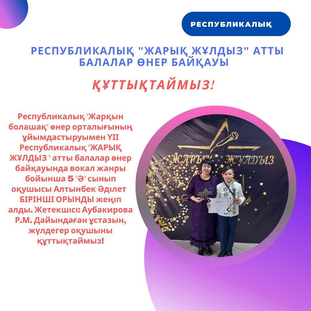 Республикалық "Жарқын болашақ" өнер орталығының ұйымдастыруымен ҮІІ Республикалық "ЖАРЫҚ ЖҰЛДЫЗ " атты балалар өнер байқауында вокал жанры бойынша 5 "Ә" сынып оқушысы Алтынбек Әділет БІРІНШІ ОРЫНДЫ жеңіп алды.