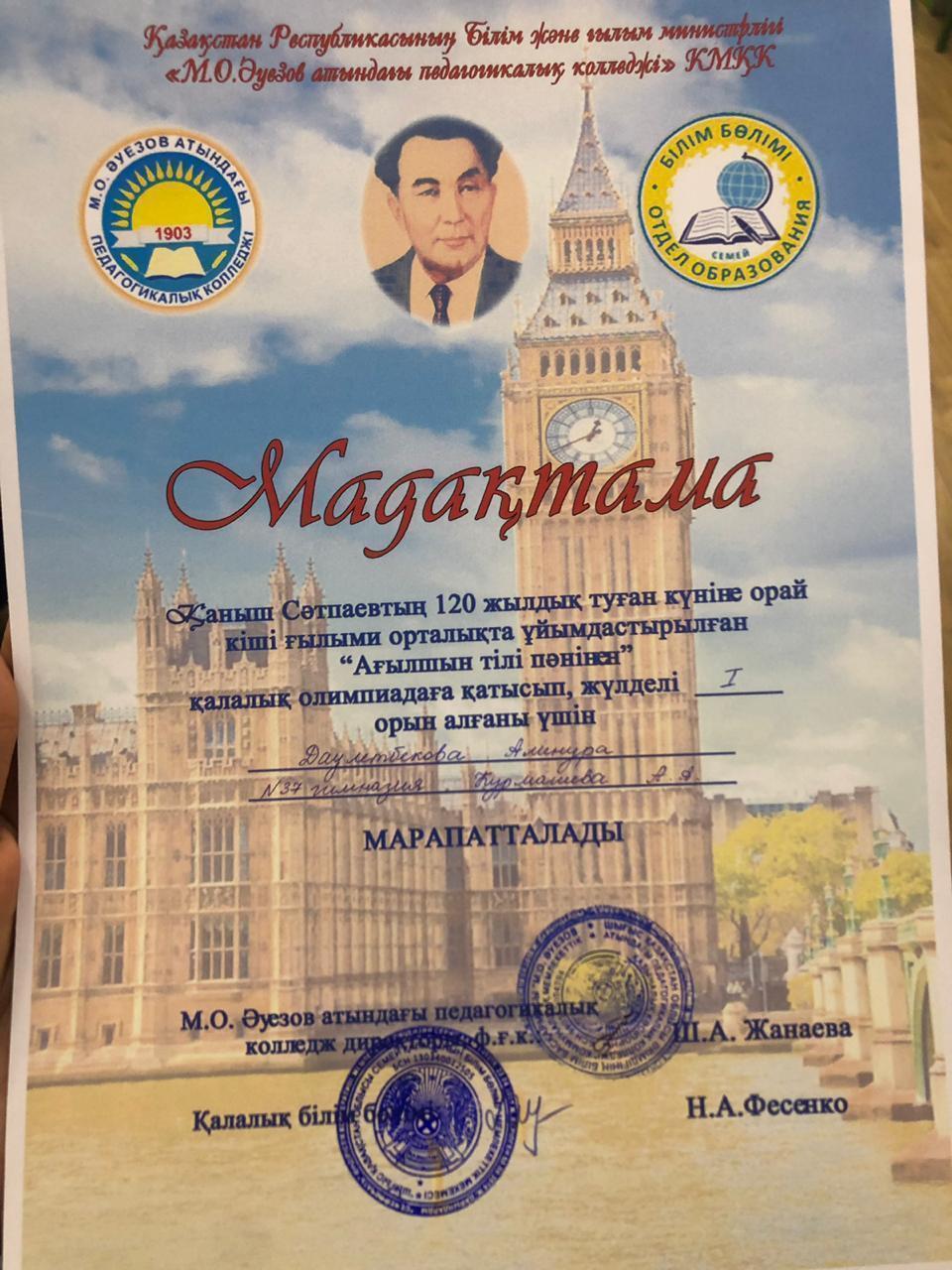 21 ноябрь 2019 0 1 2 3 4 5 Ағылшын тілі пәнінен қалалық олимпиада. Қаныш Сәтбаевтың 120 жылдық туған күніне орай ұйымдастырылған "Ағылшын тілі" пәнінен қалалық олимпиадада Даулетбекова Алинура және Аримбаева Дильназ жүлделі 1-орынға ие болса, Жүнісова Азиза 3-орынға ие болды.